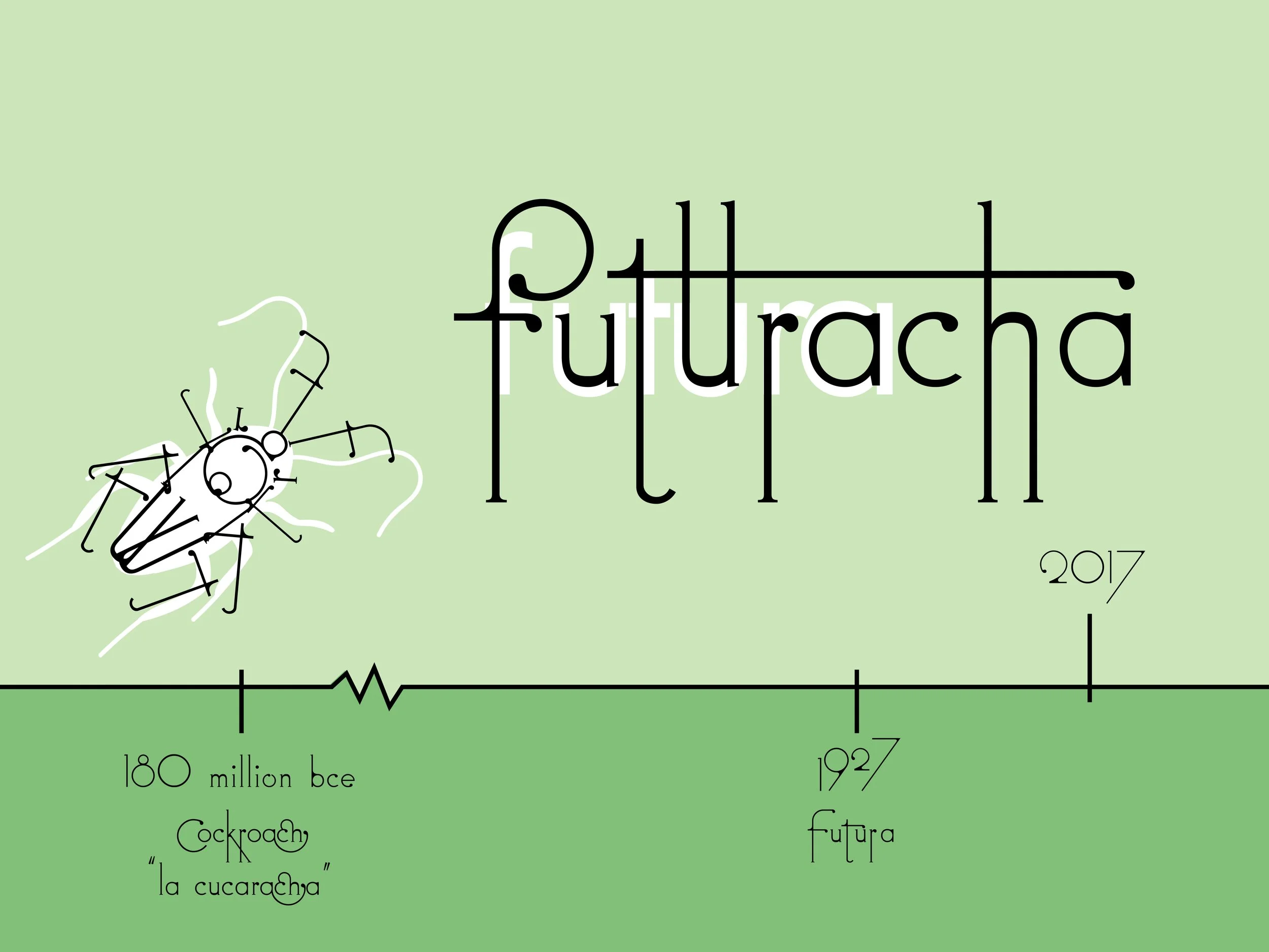 This two-sided informational poster highlights the history and unique qualities of Futuracha, a quirky typeface which mimics the letterforms of Futura but adds characteristic flourishes inspired by the spurs of Caribbean cockroaches (“cucarachas”).